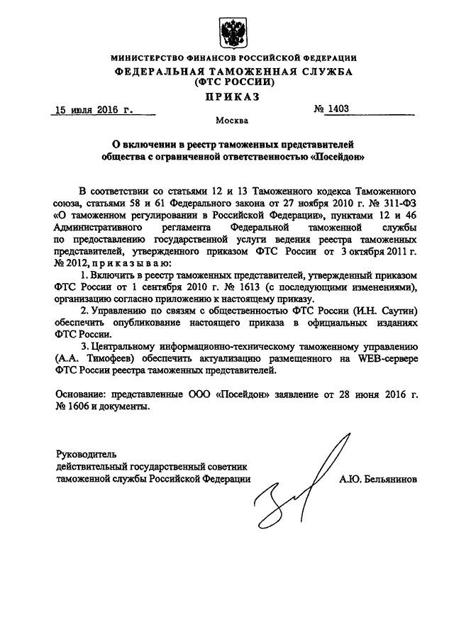 ПРИКАЗ ФТС РФ от 15.07.2016 N 1403