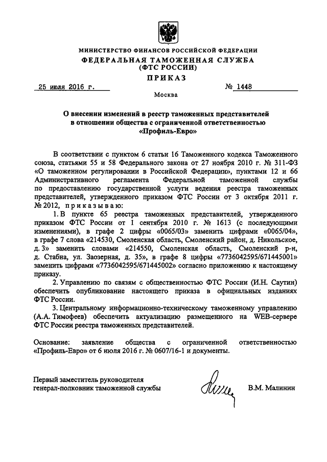"О ВНЕСЕНИИ ИЗМЕНЕНИЙ В РЕЕСТР ТАМОЖЕННЫХ ПРЕДСТАВИТЕЛЕЙ В ОТНОШЕНИИ ОБЩЕСТВА С ОГРАНИЧЕННОЙ ОТВЕТСТВЕННОСТЬЮ "ПРОФИЛЬ-ЕВРО"