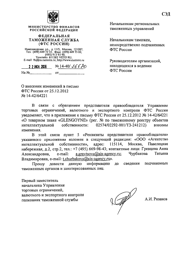 "О ВНЕСЕНИИ ИЗМЕНЕНИЙ В ПИСЬМО ФТС РОССИИ ОТ 25.12.2012 N 14-42/64221"