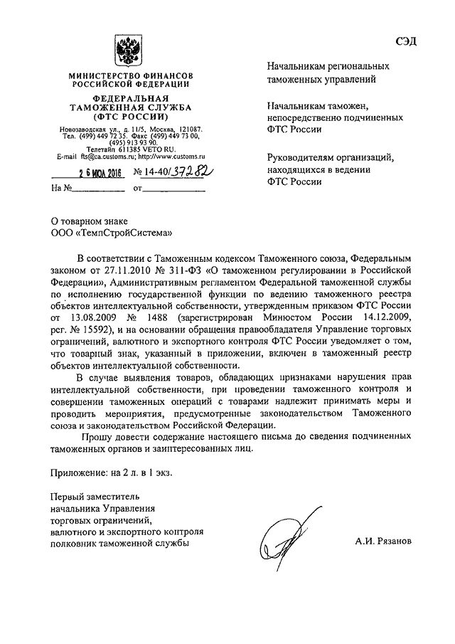 ПИСЬМО ФТС РФ от 26.07.2016 N 14-40/37282