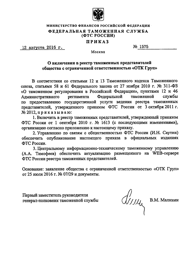 ПРИКАЗ ФТС РФ от 12.08.2016 N 1575