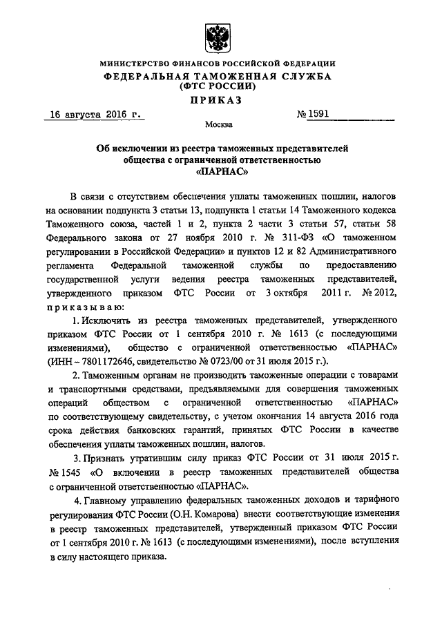 ПРИКАЗ ФТС РФ от 16.08.2016 N 1591