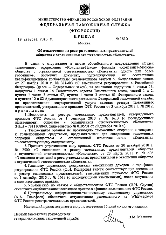 "ОБ ИСКЛЮЧЕНИИ ИЗ РЕЕСТРА ТАМОЖЕННЫХ ПРЕДСТАВИТЕЛЕЙ ОБЩЕСТВА С ОГРАНИЧЕННОЙ ОТВЕТСТВЕННОСТЬЮ "КОНСТАНТА"