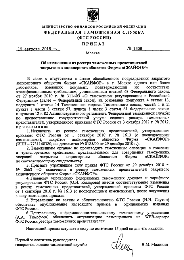 "ОБ ИСКЛЮЧЕНИИ ИЗ РЕЕСТРА ТАМОЖЕННЫХ ПРЕДСТАВИТЕЛЕЙ ЗАКРЫТОГО АКЦИОНЕРНОГО ОБЩЕСТВА ФИРМА "СКАЙФОР"