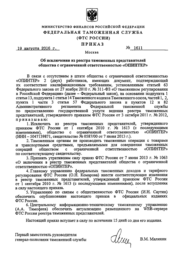 ПРИКАЗ ФТС РФ от 19.08.2016 N 1611