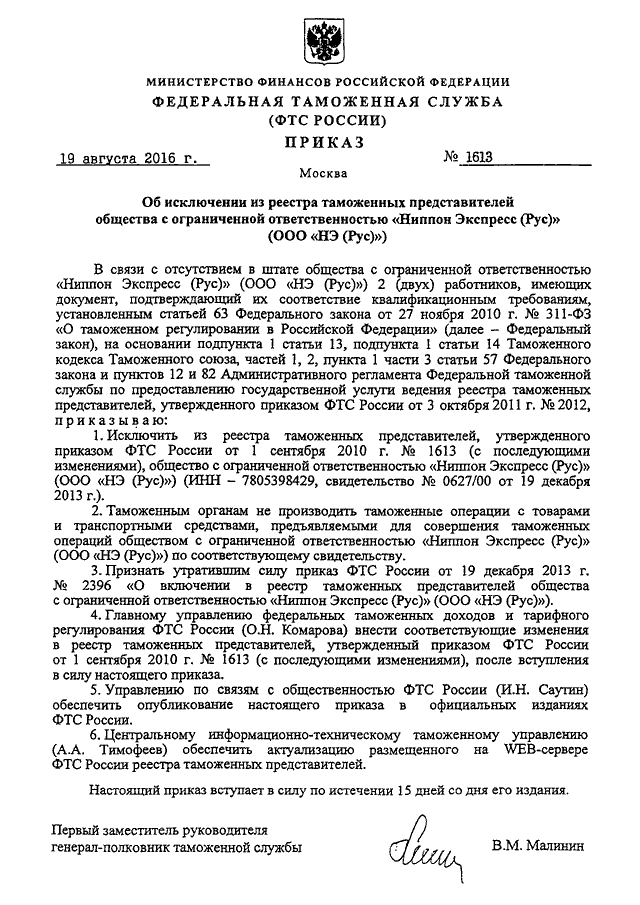 "ОБ ИСКЛЮЧЕНИИ ИЗ РЕЕСТРА ТАМОЖЕННЫХ ПРЕДСТАВИТЕЛЕЙ ОБЩЕСТВА С ОГРАНИЧЕННОЙ ОТВЕТСТВЕННОСТЬЮ "НИППОН ЭКСПРЕСС (РУС)" (ООО "НЭ (РУС)")"