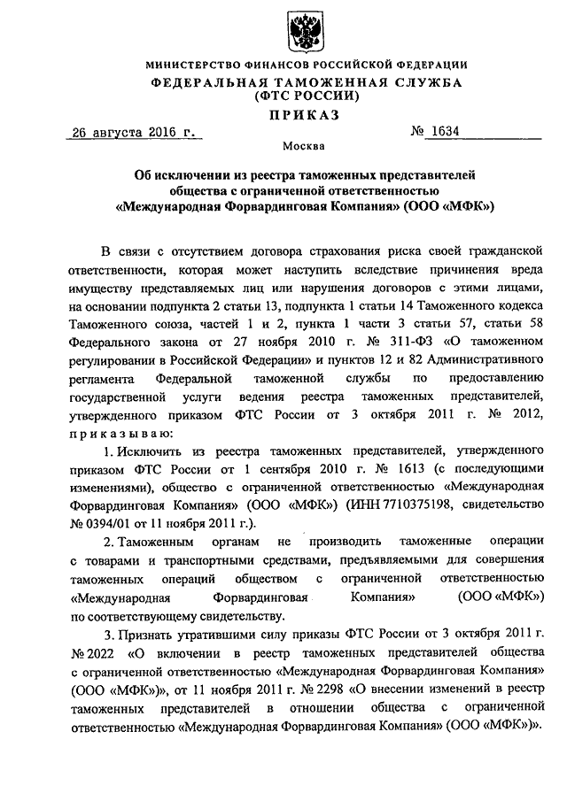 "ОБ ИСКЛЮЧЕНИИ ИЗ РЕЕСТРА ТАМОЖЕННЫХ ПРЕДСТАВИТЕЛЕЙ ОБЩЕСТВА С ОГРАНИЧЕННОЙ ОТВЕТСТВЕННОСТЬЮ "МЕЖДУНАРОДНАЯ ФОРВАРДИНГОВАЯ КОМПАНИЯ" (ООО "МФК")"