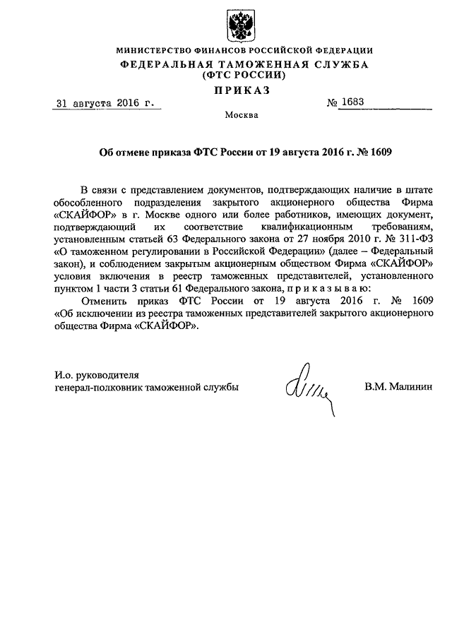 "ОБ ОТМЕНЕ ПРИКАЗА ФТС РОССИИ ОТ 19 АВГУСТА 2016 Г. N 1609"