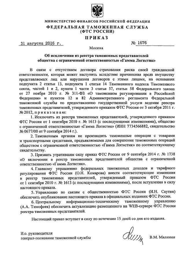 "ОБ ИСКЛЮЧЕНИИ ИЗ РЕЕСТРА ТАМОЖЕННЫХ ПРЕДСТАВИТЕЛЕЙ ОБЩЕСТВА С ОГРАНИЧЕННОЙ ОТВЕТСТВЕННОСТЬЮ "ГАММА ЛОГИСТИК"