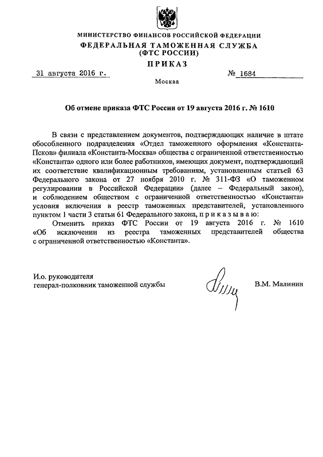 "ОБ ОТМЕНЕ ПРИКАЗА ФТС РОССИИ ОТ 19 АВГУСТА 2016 Г. N 1610"