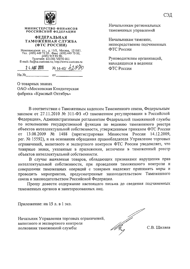 ПИСЬМО ФТС РФ от 24.08.2016 N 14-40/42770