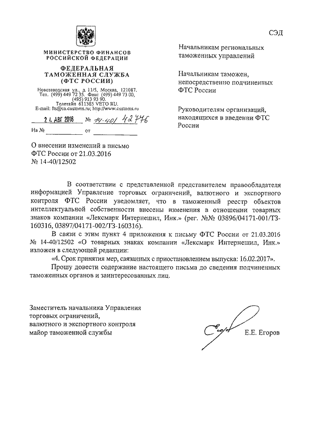 "О ВНЕСЕНИИ ИЗМЕНЕНИЙ В ПИСЬМО ФТС РОССИИ ОТ 21.03.2016 N 14-40/12502"