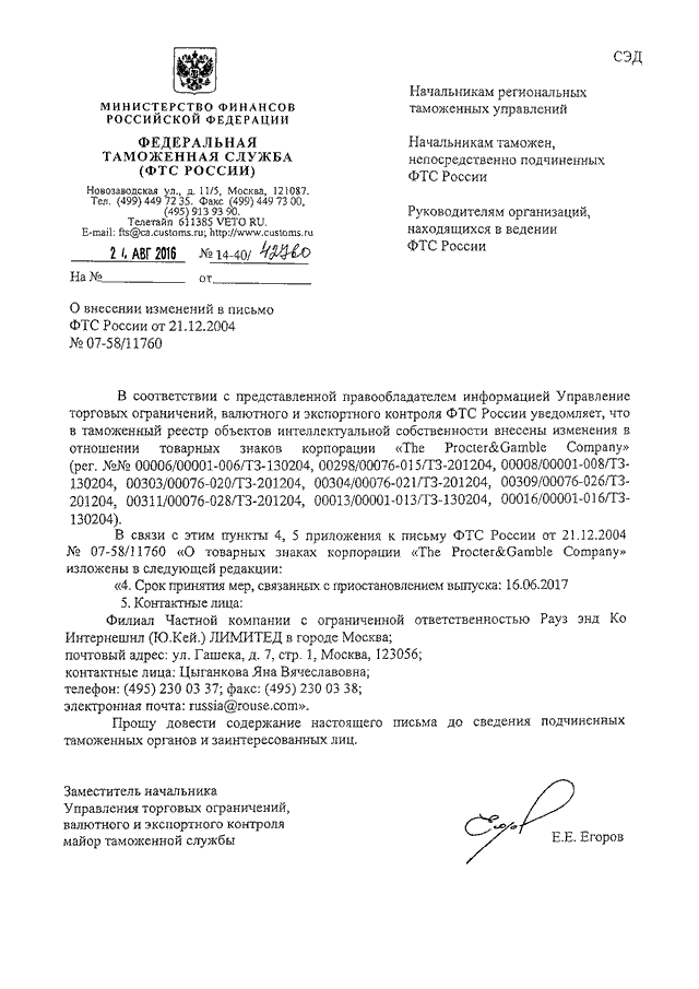 ПИСЬМО ФТС РФ от 24.08.2016 N 14-40/42760