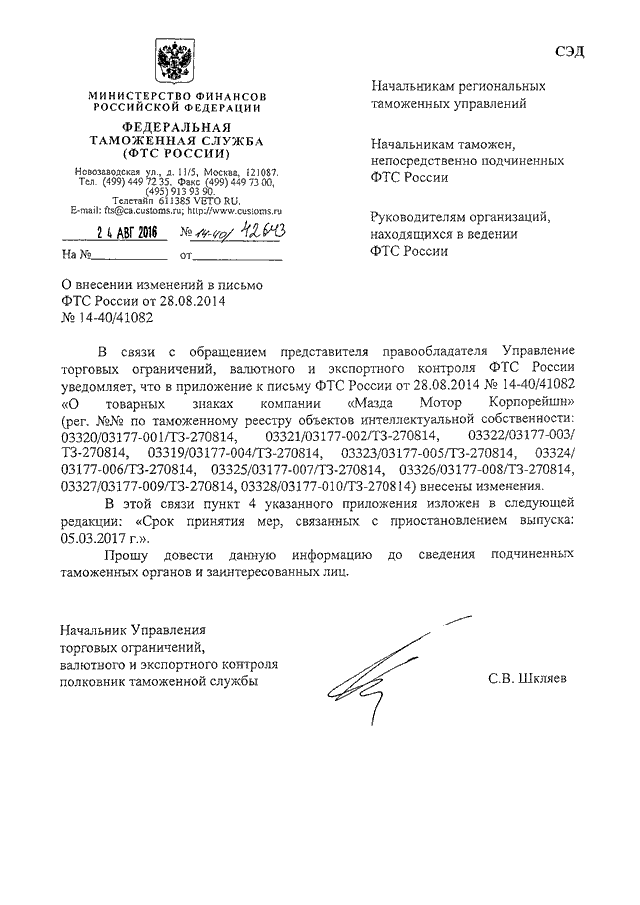 "О ВНЕСЕНИИ ИЗМЕНЕНИЙ В ПИСЬМО ФТС РОССИИ ОТ 28.08.2014 N 14-40/41082"