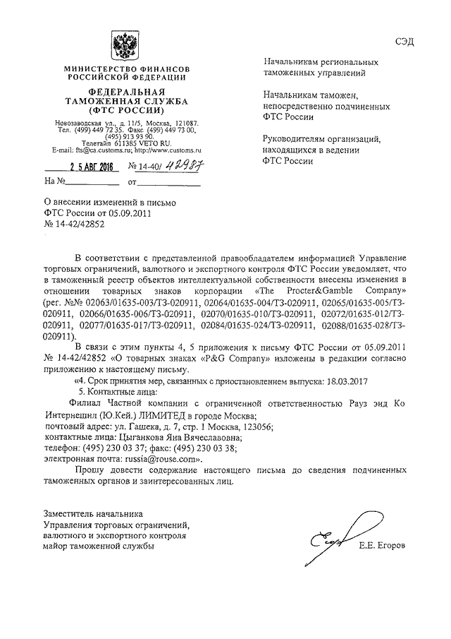 "О ВНЕСЕНИИ ИЗМЕНЕНИЙ В ПИСЬМО ФТС РОССИИ ОТ 05.09.2011 N 14-42/42852"