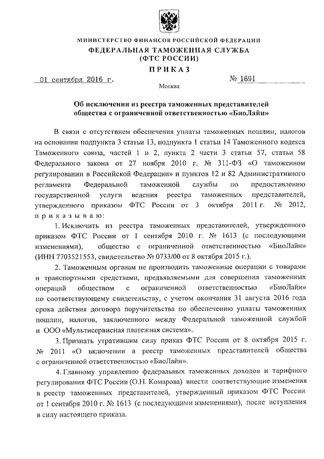 ПРИКАЗ ФТС РФ от 01.09.2016 N 1691