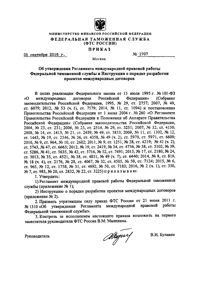 ПРИКАЗ ФТС РФ от 05.09.2016 N 1707
