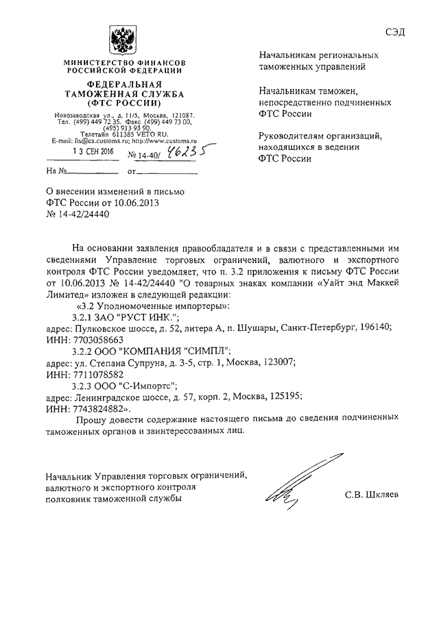 ПИСЬМО ФТС РФ от 13.09.2016 N 14-40/46235