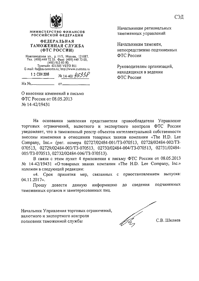 ПИСЬМО ФТС РФ от 13.09.2016 N 14-40/46338