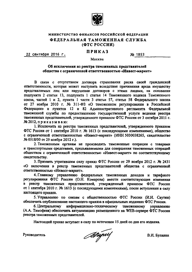 ПРИКАЗ ФТС РФ от 22.09.2016 N 1853