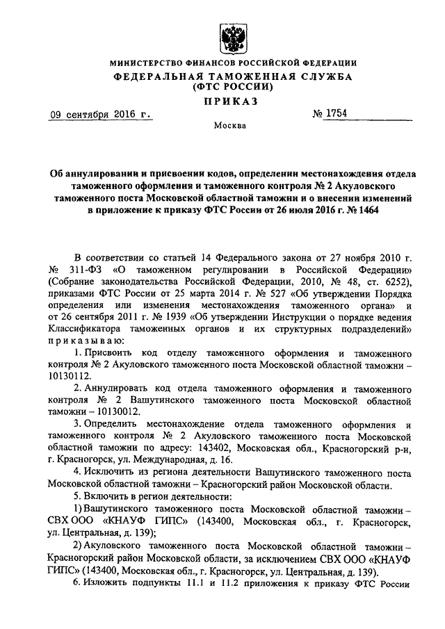 ПРИКАЗ ФТС РФ от 09.09.2016 N 1754