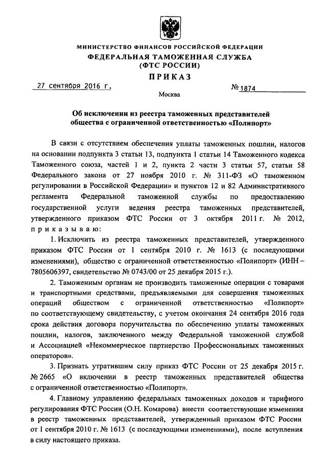 ПРИКАЗ ФТС РФ от 27.09.2016 N 1874