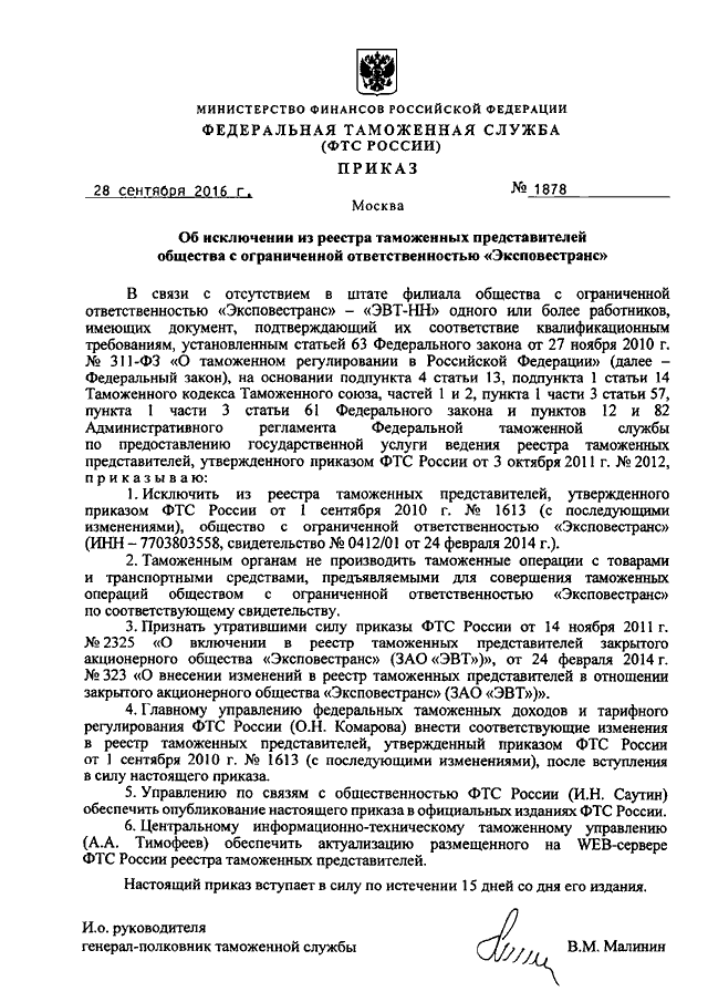 ПРИКАЗ ФТС РФ от 28.09.2016 N 1878