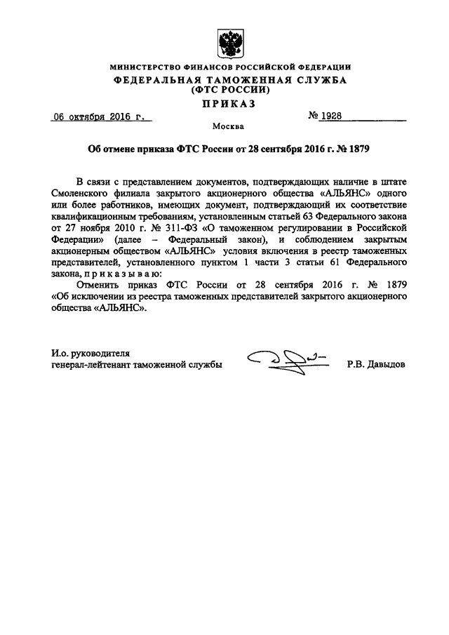 "ОБ ОТМЕНЕ ПРИКАЗА ФТС РОССИИ ОТ 28 СЕНТЯБРЯ 2016 Г. N 1879"