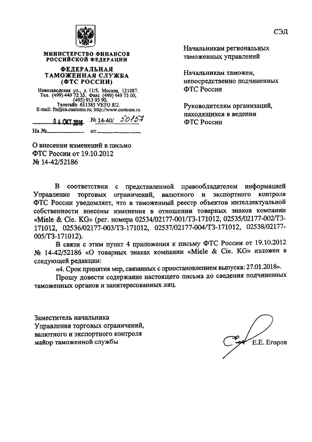 "О ВНЕСЕНИИ ИЗМЕНЕНИЙ В ПИСЬМО ФТС РОССИИ ОТ 19.10.2012 N 14-42/52186"