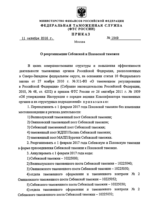 ПРИКАЗ ФТС РФ от 11.10.2016 N 1949