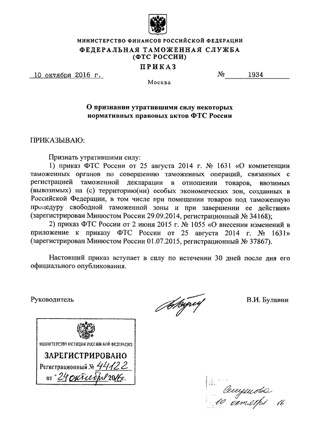 ПРИКАЗ ФТС РФ от 10.10.2016 N 1934