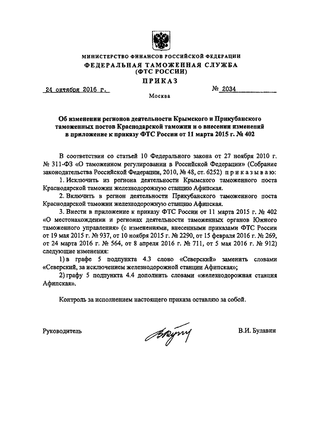 ПРИКАЗ ФТС РФ от 24.10.2016 N 2034