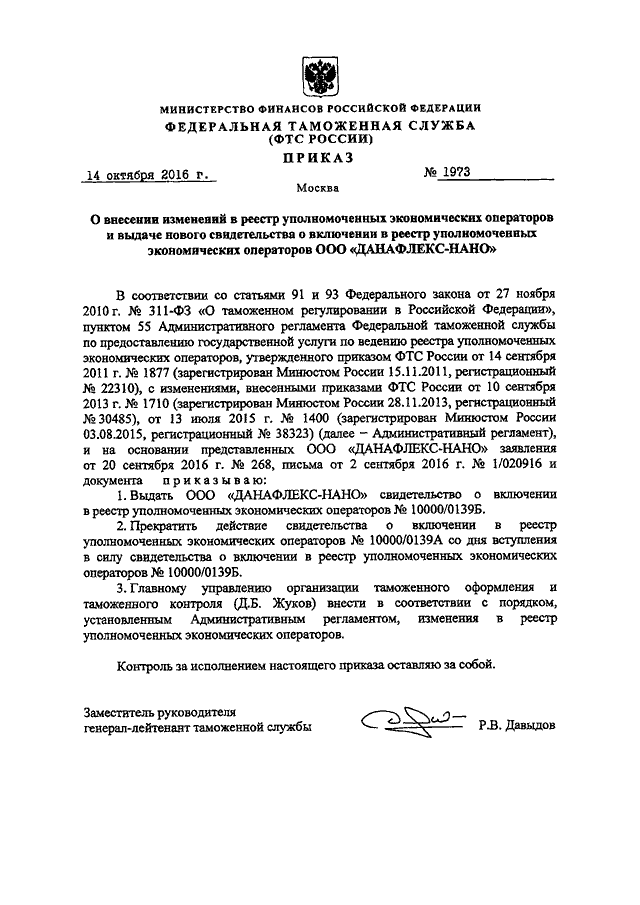 "О ВНЕСЕНИИ ИЗМЕНЕНИЙ В РЕЕСТР УПОЛНОМОЧЕННЫХ ЭКОНОМИЧЕСКИХ ОПЕРАТОРОВ И ВЫДАЧЕ НОВОГО СВИДЕТЕЛЬСТВА О ВКЛЮЧЕНИИ В РЕЕСТР УПОЛНОМОЧЕННЫХ ЭКОНОМИЧЕСКИХ ОПЕРАТОРОВ ООО "ДАНАФЛЕКС-НАНО"