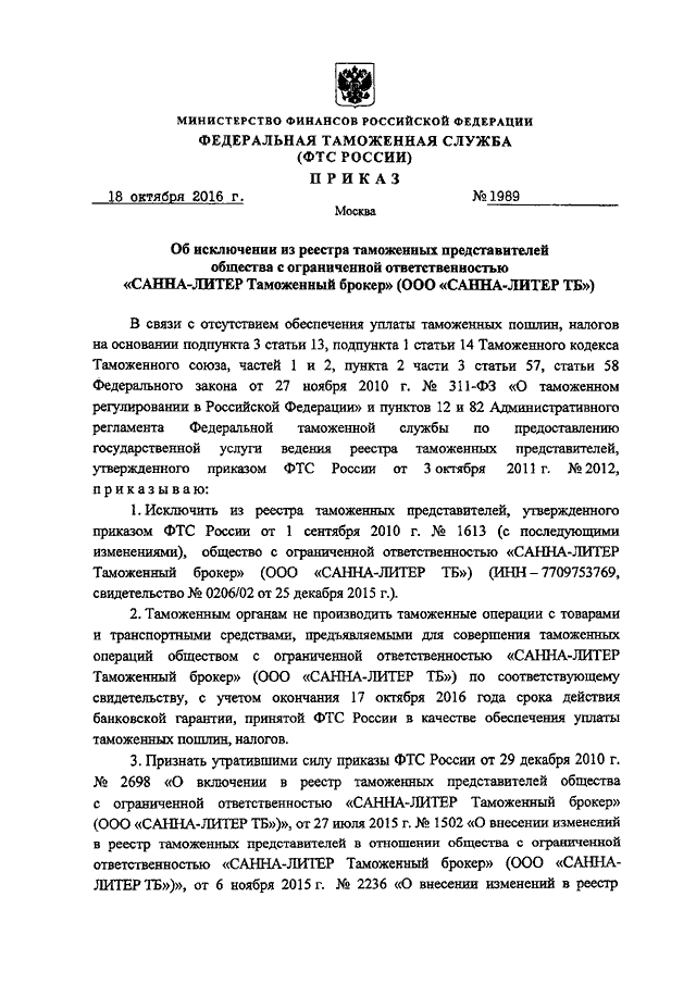 "ОБ ИСКЛЮЧЕНИИ ИЗ РЕЕСТРА ТАМОЖЕННЫХ ПРЕДСТАВИТЕЛЕЙ ОБЩЕСТВА С ОГРАНИЧЕННОЙ ОТВЕТСТВЕННОСТЬЮ "САННА-ЛИТЕР ТАМОЖЕННЫЙ БРОКЕР" (ООО "САННА-ЛИТЕР ТБ")"