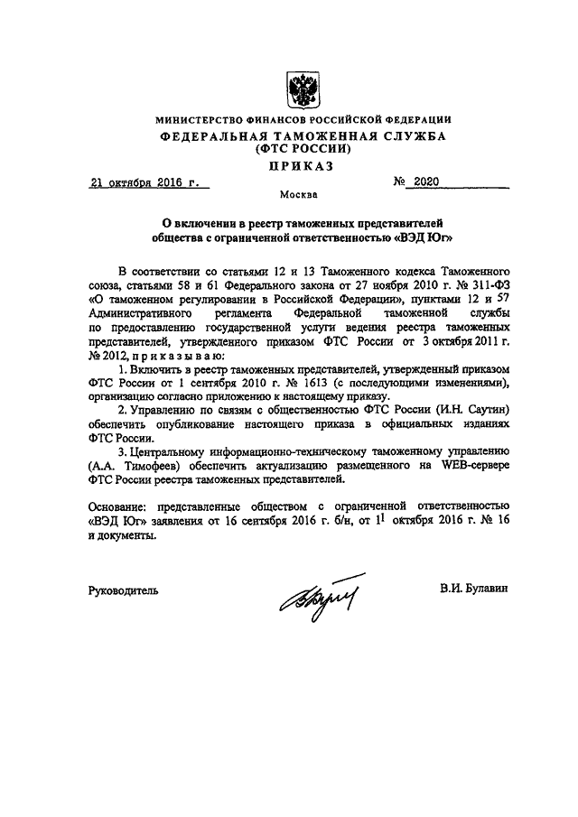ПРИКАЗ ФТС РФ от 21.10.2016 N 2020