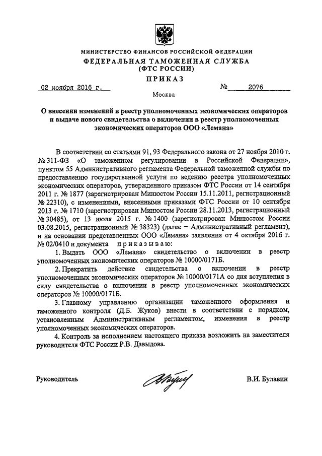 "О ВНЕСЕНИИ ИЗМЕНЕНИЙ В РЕЕСТР УПОЛНОМОЧЕННЫХ ЭКОНОМИЧЕСКИХ ОПЕРАТОРОВ И ВЫДАЧЕ НОВОГО СВИДЕТЕЛЬСТВА О ВКЛЮЧЕНИИ В РЕЕСТР УПОЛНОМОЧЕННЫХ ЭКОНОМИЧЕСКИХ ОПЕРАТОРОВ ООО "ЛЕМАНА"