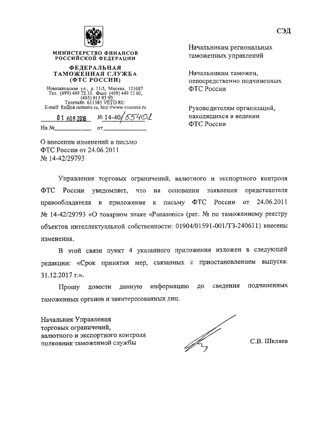 ПИСЬМО ФТС РФ от 01.11.2016 N 14-40/55401