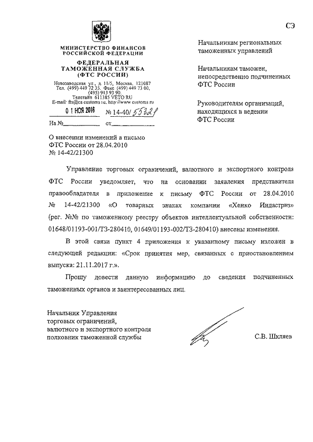 ПИСЬМО ФТС РФ от 01.11.2016 N 14-40/55321