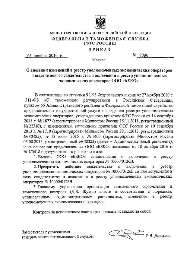 ПРИКАЗ ФТС РФ от 08.11.2016 N 2096
