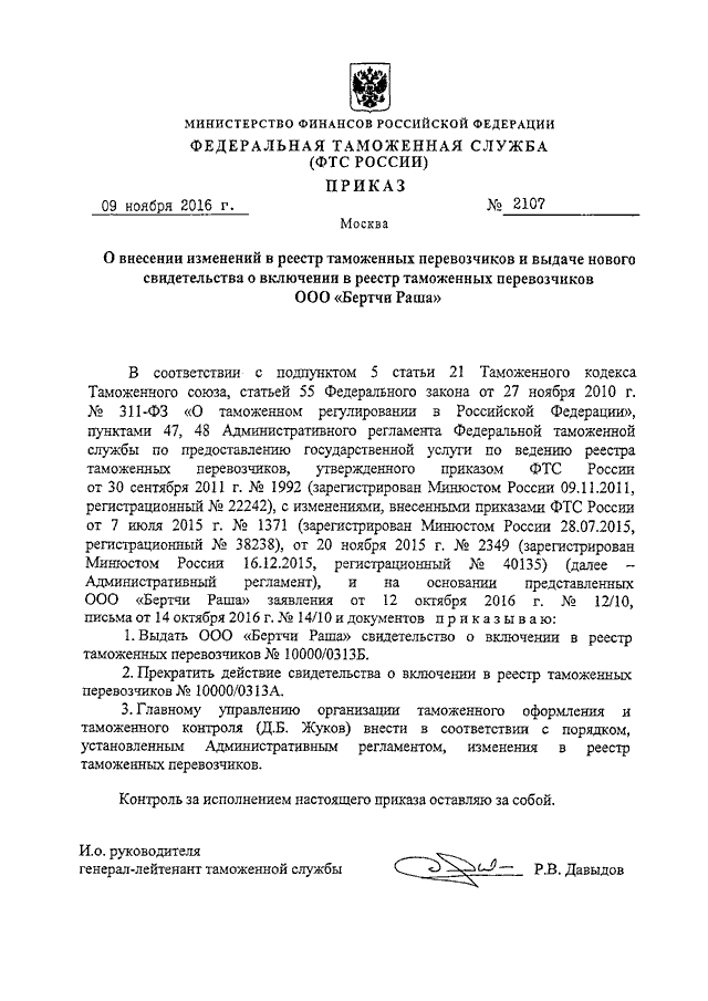 "О ВНЕСЕНИИ ИЗМЕНЕНИЙ В РЕЕСТР ТАМОЖЕННЫХ ПЕРЕВОЗЧИКОВ И ВЫДАЧЕ НОВОГО СВИДЕТЕЛЬСТВА О ВКЛЮЧЕНИИ В РЕЕСТР ТАМОЖЕННЫХ ПЕРЕВОЗЧИКОВ ООО "БЕРТЧИ РАША"