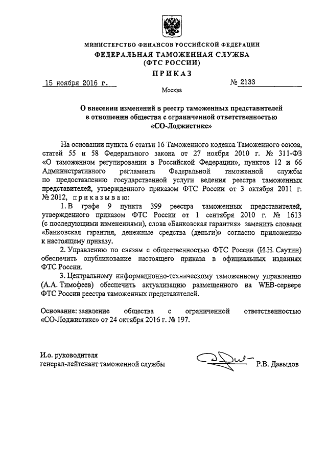 ПРИКАЗ ФТС РФ от 15.11.2016 N 2133