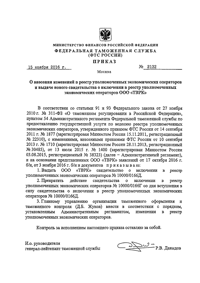 ПРИКАЗ ФТС РФ от 15.11.2016 N 2132
