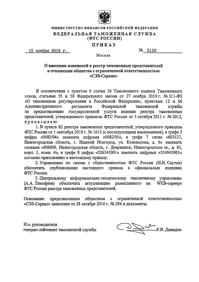 ПРИКАЗ ФТС РФ от 15.11.2016 N 2128