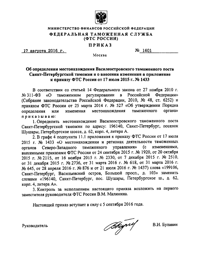 ПРИКАЗ ФТС РФ от 17.08.2016 N 1601