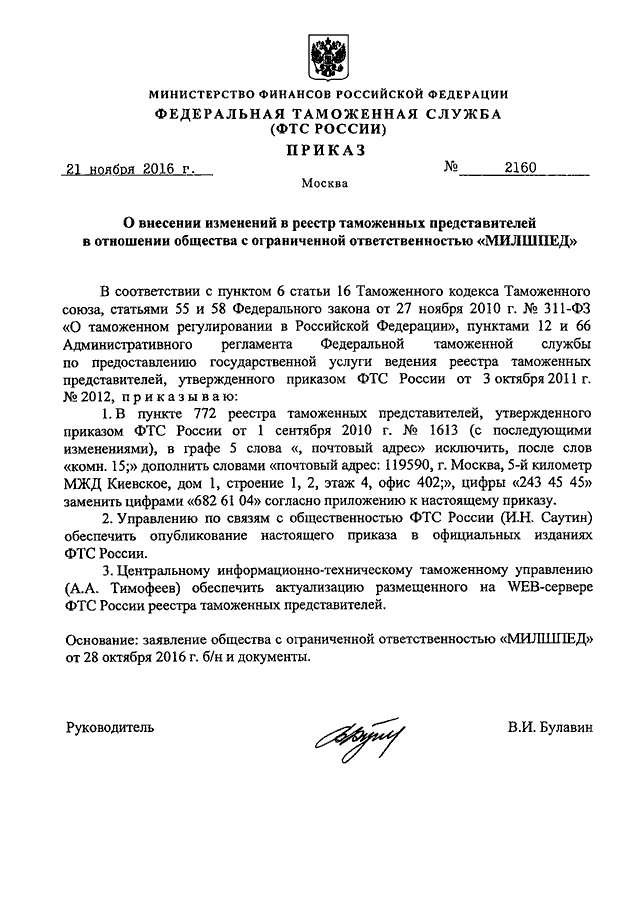 ПРИКАЗ ФТС РФ от 21.11.2016 N 2160
