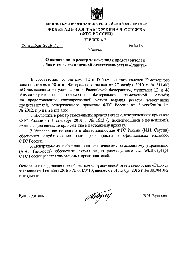 "О ВКЛЮЧЕНИИ В РЕЕСТР ТАМОЖЕННЫХ ПРЕДСТАВИТЕЛЕЙ ОБЩЕСТВА С ОГРАНИЧЕННОЙ ОТВЕТСТВЕННОСТЬЮ "РАДИУС"