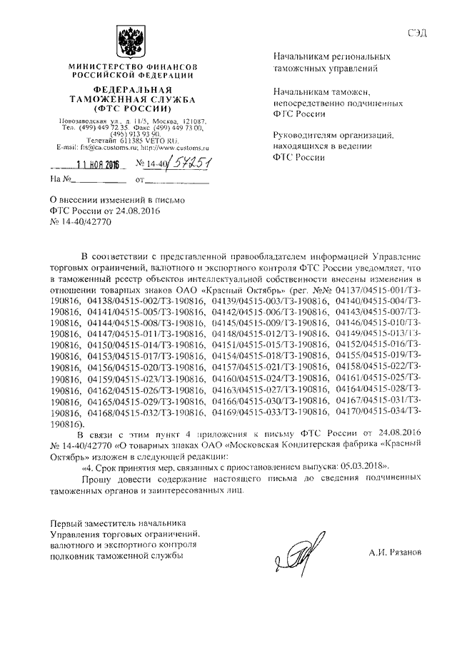 "О ВНЕСЕНИИ ИЗМЕНЕНИЙ В ПИСЬМО ФТС РОССИИ ОТ 24.08.2016 N 14-40/42770"