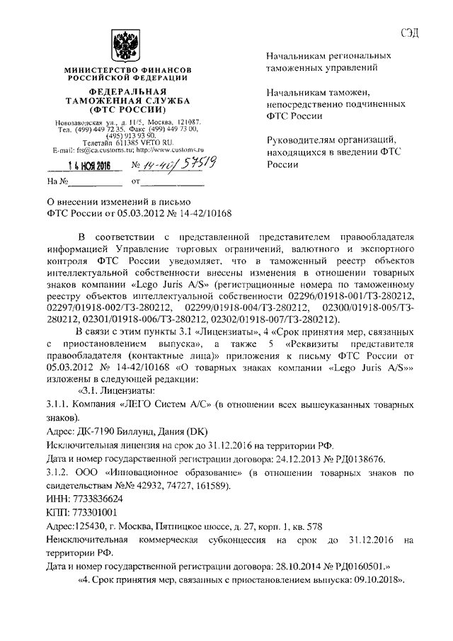 "О ВНЕСЕНИИ ИЗМЕНЕНИЙ В ПИСЬМО ФТС РОССИИ ОТ 05.03.2012 N 14-42/10168"