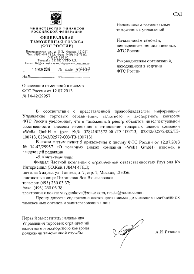 "О ВНЕСЕНИИ ИЗМЕНЕНИЙ В ПИСЬМО ФТС РОССИИ ОТ 12.07.2013 N 14-42/29957"