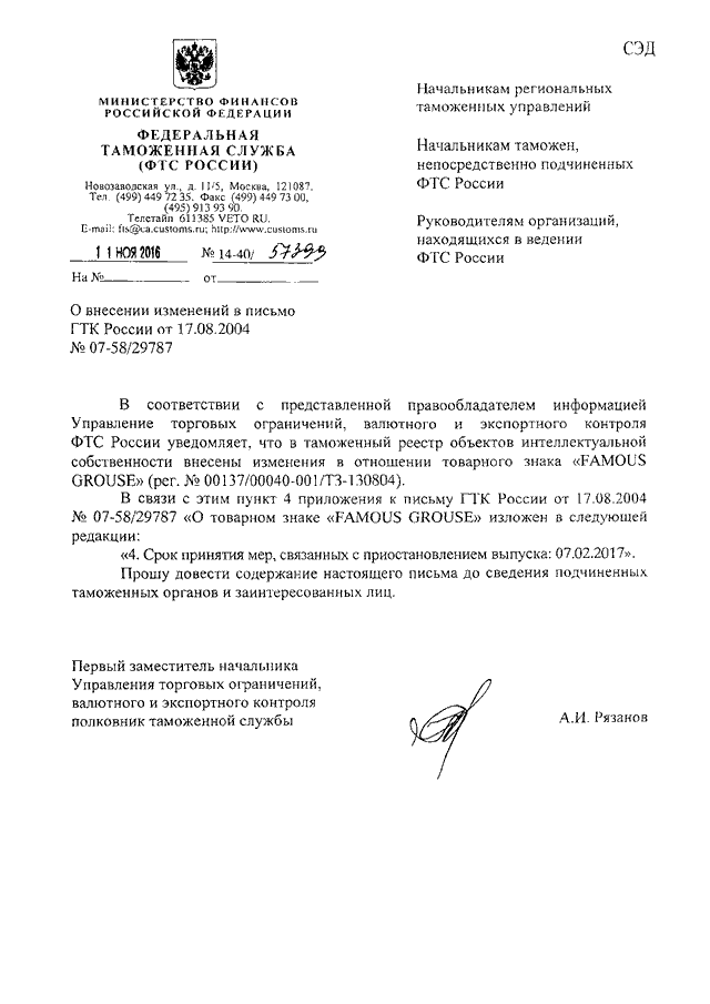 ПИСЬМО ФТС РФ от 11.11.2016 N 14-40/57399